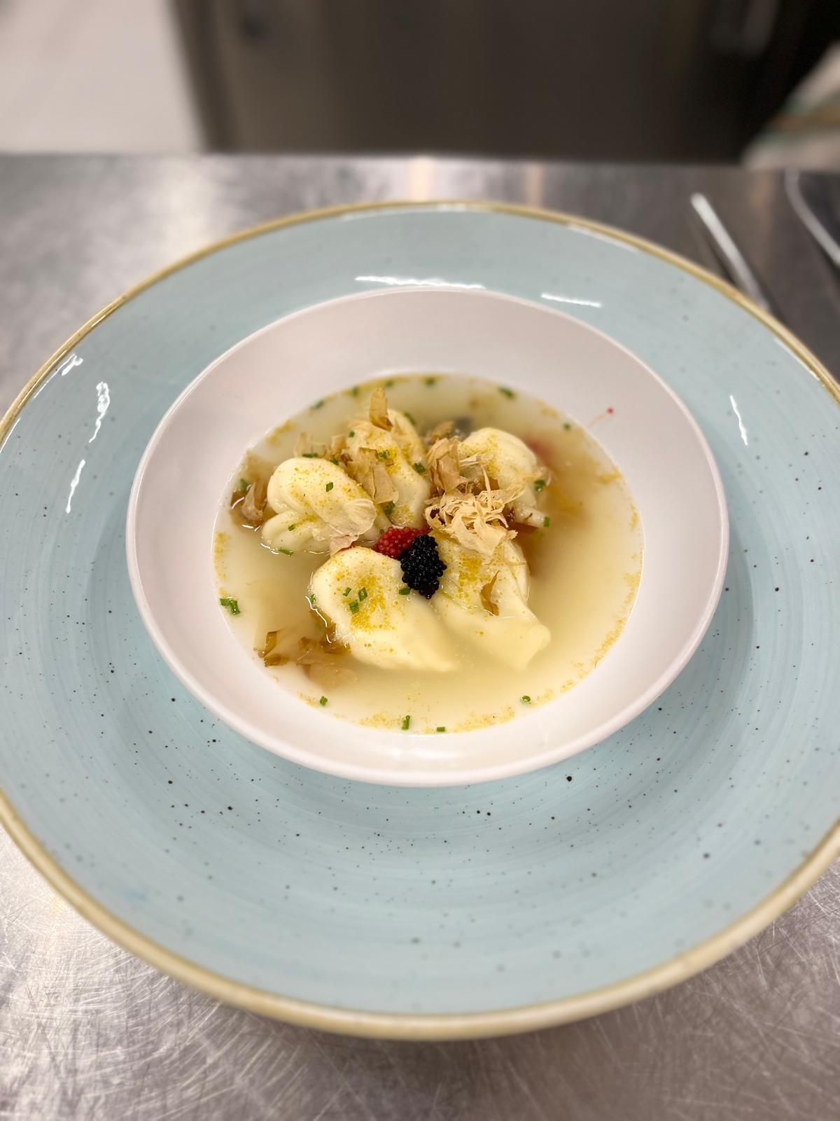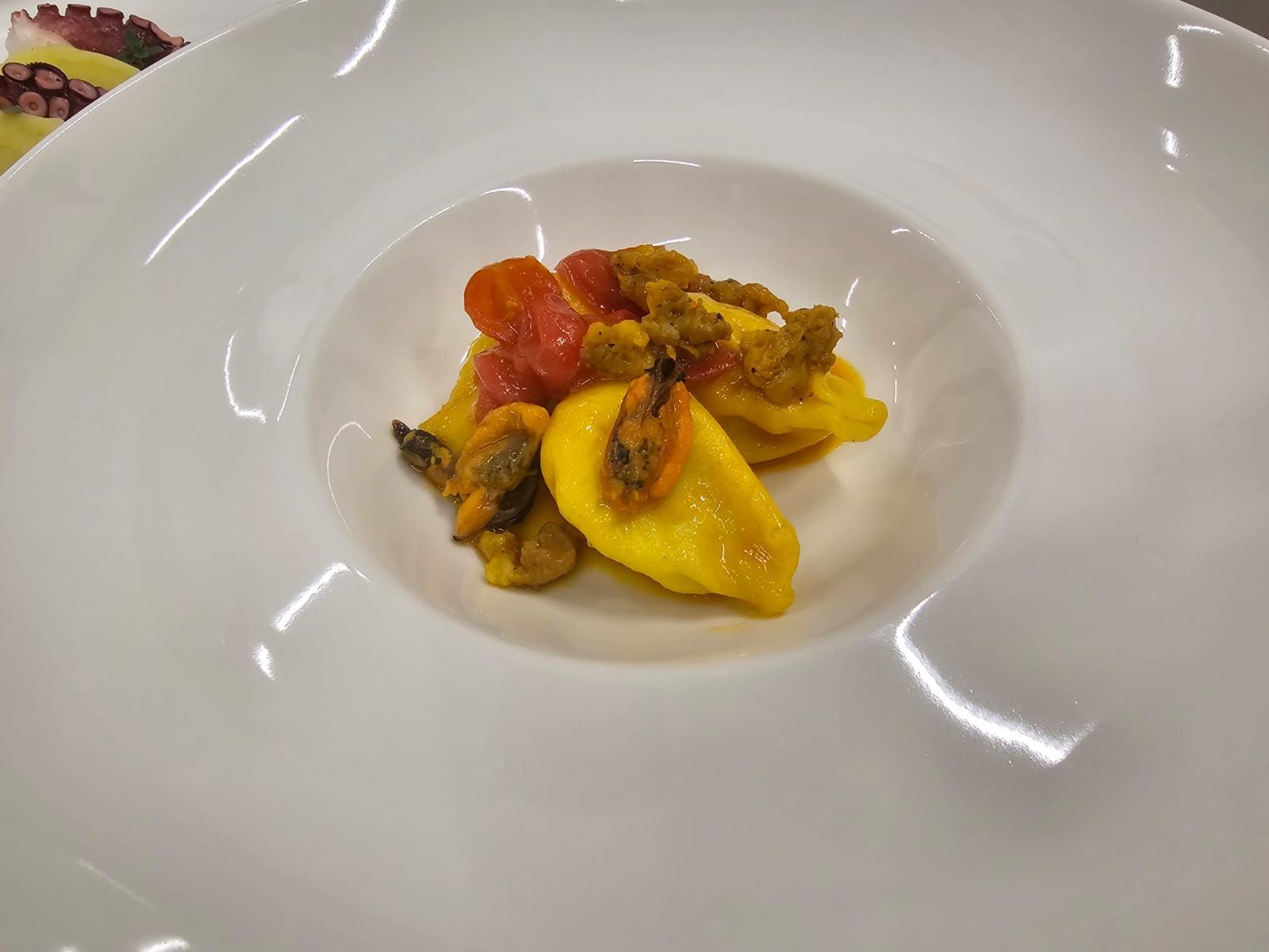 Tipical fresh pasta whit potato, mussels, datterino cream and mullet roe 1-4-7-14